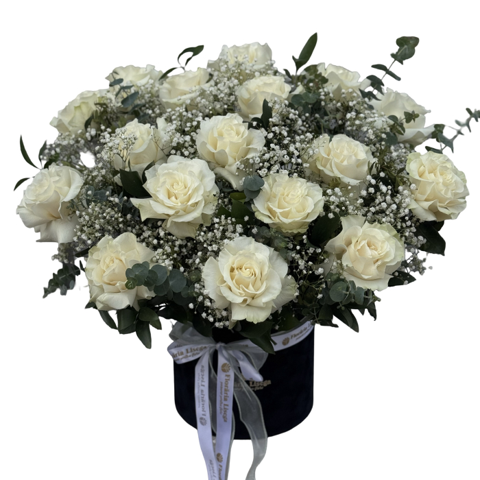 Aranjament in cutie de catifea cu 17 trandafiri albi petalați însoțiți de gipsophila și eucalipt, nuanțe elegante și classice care spun totul!