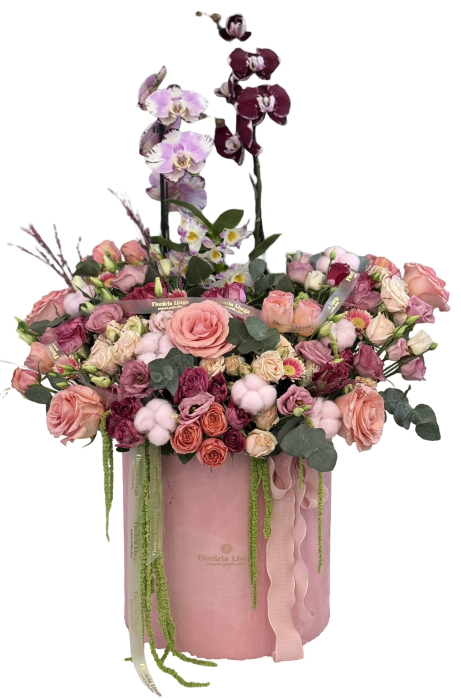 Aranjamentul Deluxe gigant contine: 5 trandafiri, 15 minirosa, 5 eustoma, 7 bumbac, eucalipt, 1 orhidee la ghiveci, amaranthus, cutie catifea gigant, panglica inscriptionata