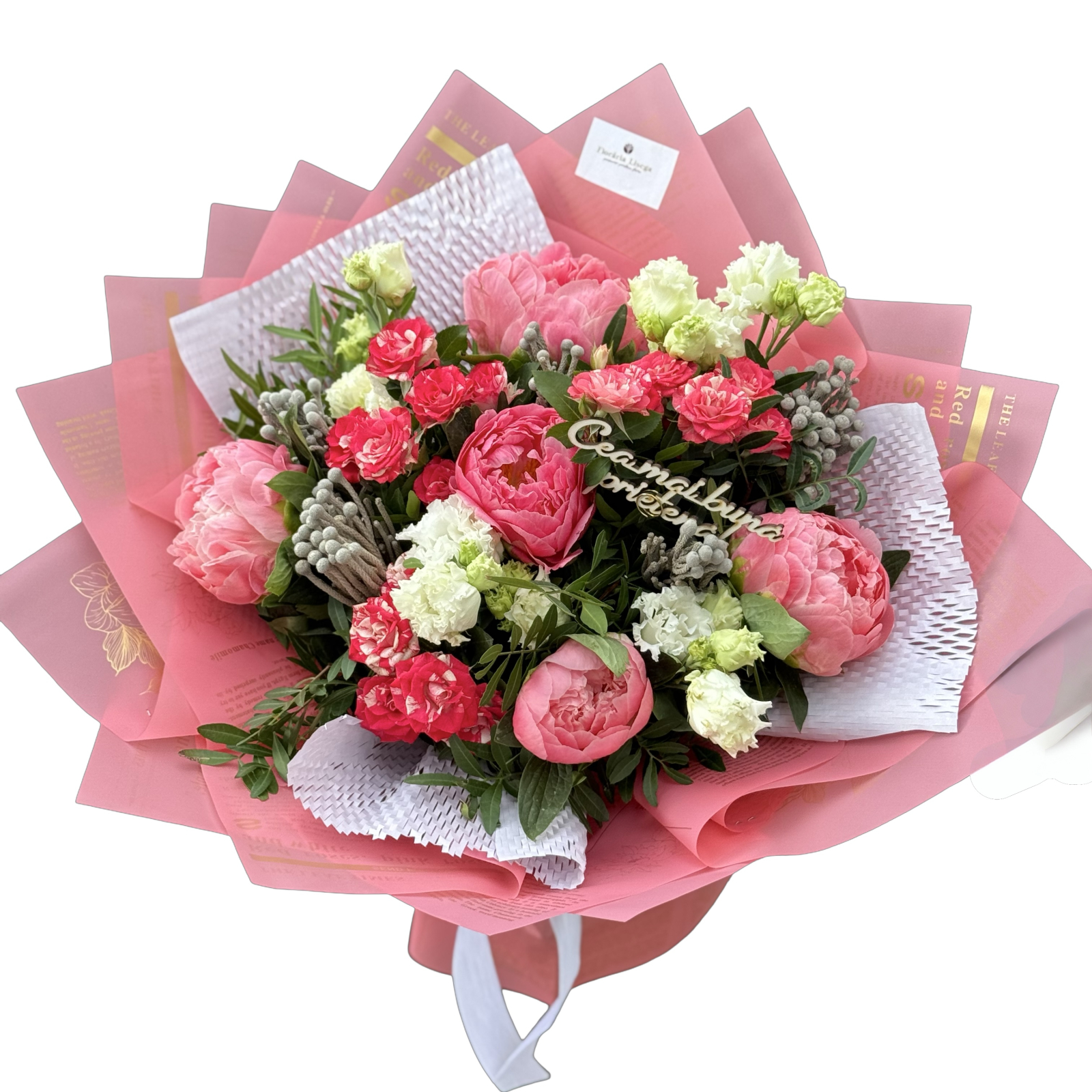 Buchet asortat pe nuanțe de roz intens și alb, buchetul este o combinație armonioasa de bujori, minirosa, eustoma și brunia, ideal pentru mulțumiri, zile de naștere sau doar pentru a transmite un mesaj de bucurie și apreciere!