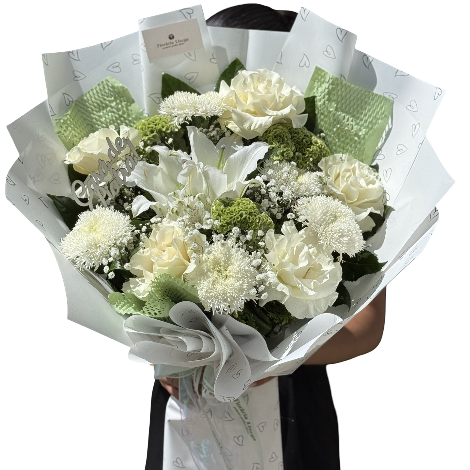 Buchet asortat pe nuanțe elegante de alb și verde, flori selectate cu grijă, trandafiri albi petalați, crizantema bulb, celosia verde, crin alb regal și gipsophila, o compoziție plină de optimism și lux!