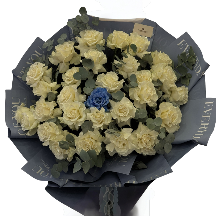 Buchet cu 27 trandafiri petalați și cu sclipici, 26 albi iar unul albastru in mijloc, ambalaj asortat albastru, pentru momente speciale si specifice persoanei dragi. Un buchet elegant, potrivit pentru a transmite afecțiune, apreciere sau a marca momente speciale. Ideal pentru aniversări, zile de naștere, evenimente festive sau cadouri rafinate.