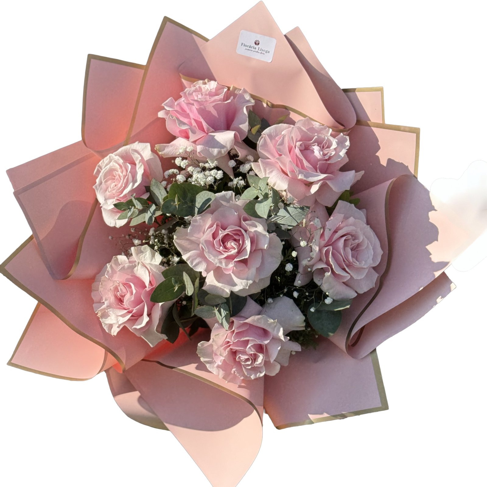 Buchet din 7 trandafiri roz pal, eucalipt și gipsophila, alegerea perfectă pentru a aduce un zâmbet persoanei dragi. Un buchet elegant, potrivit pentru a transmite afecțiune, apreciere sau a marca momente speciale. Ideal pentru aniversări, zile de naștere, evenimente festive sau cadouri rafinate.