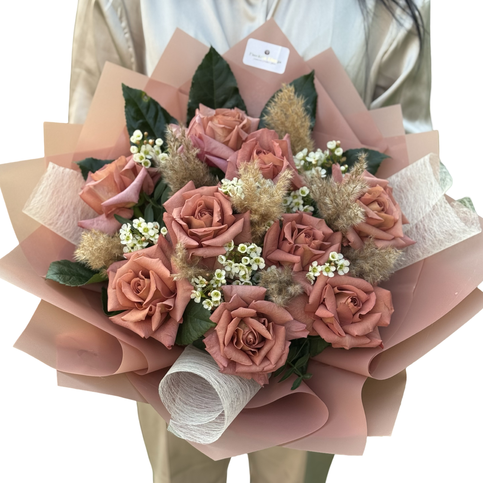 Buchet cu 9 trandafiri petalați barista, detalii cu floricele de wax si pampas, ideal pentru persoane cu gusturi mai sofisticate si ocazii deosebite. Un buchet elegant, potrivit pentru a transmite afecțiune, apreciere sau a marca momente speciale. Ideal pentru aniversări, zile de naștere, evenimente festive sau cadouri rafinate.