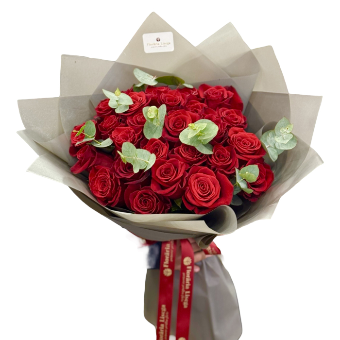 Buchetul classic contine: 25 trandafiri, eucalipt, ambalaj, panglica de saten inscriptionata