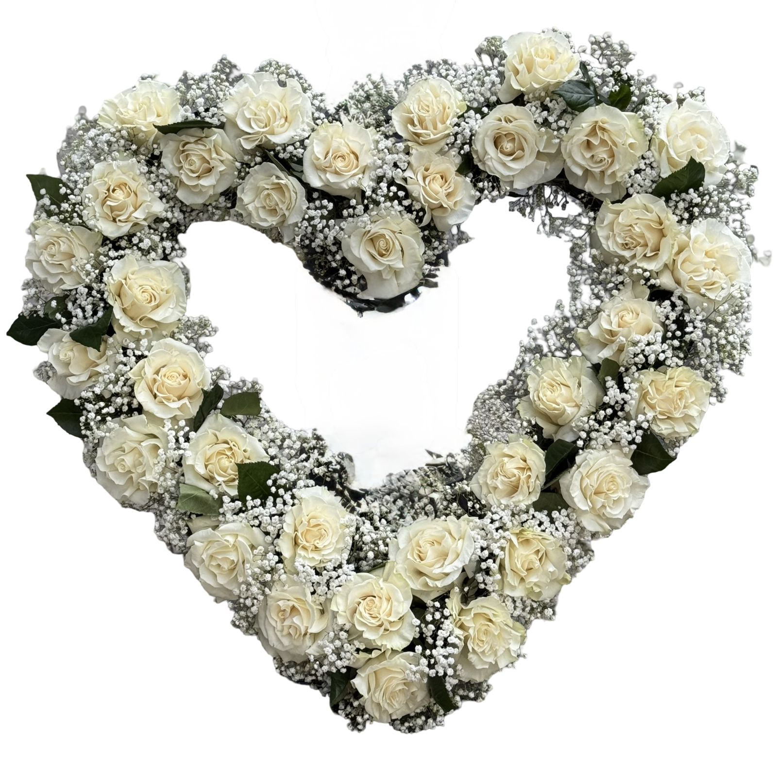 Coroană funerară 60 cm în formă de inimă realizata din trandafiri albi petalați și gipsophila, reprezintă dragostea eternă și amintirile prețuite.