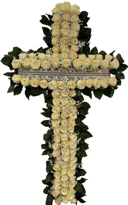 Coroană funerara în formă de cruce, 180 cm, din 100 de trandafiri albi, gipso și verdeață este un aranjament impunător și elegant, care transmite respect profund și omagiu față de persoana dragă. Trandafirii albi simbolizează puritatea și liniștea, iar combinația cu gipso și verdeață creează un design armonios și rafinat.
